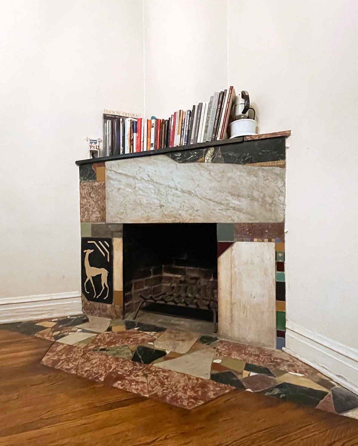 Fireplace by Edgar Miller and/or Jesús Torres; books and bookends by resident