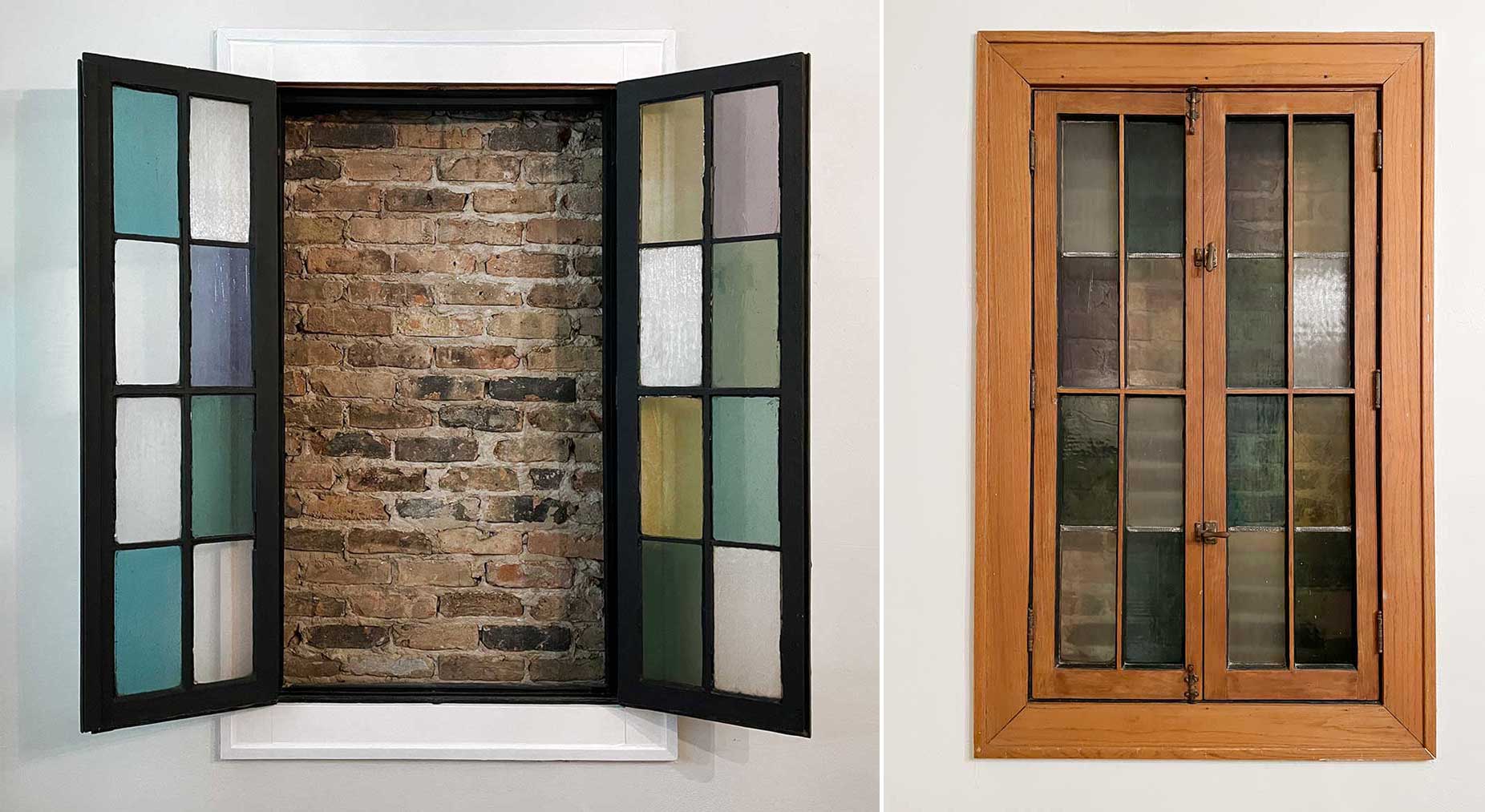North-facing stained glass window with lead cutouts by Edgar Miller, assemblage by current resident; see documented light change during the day.